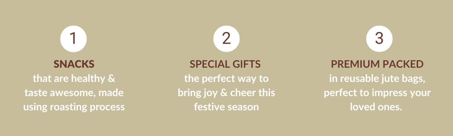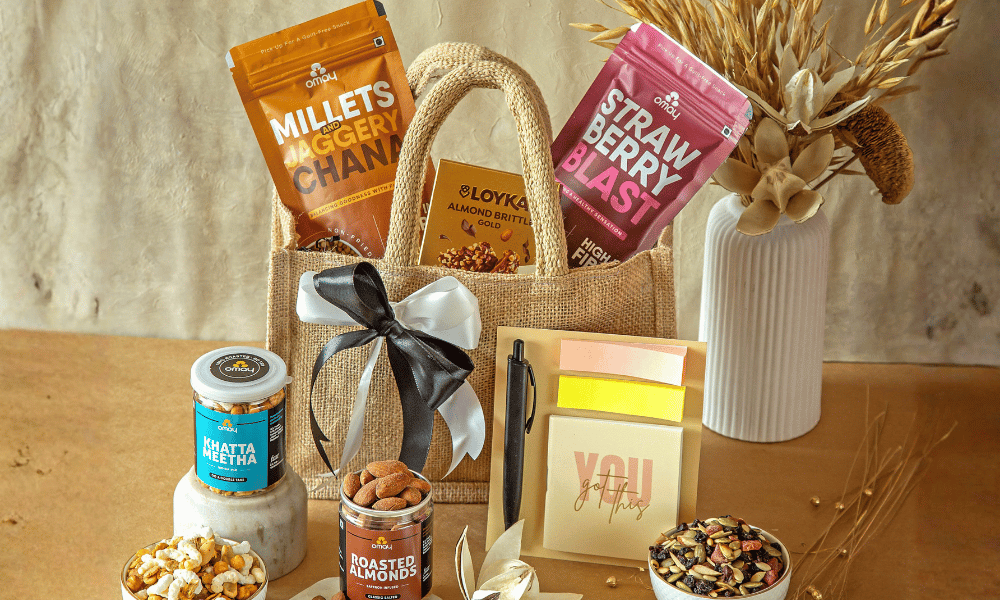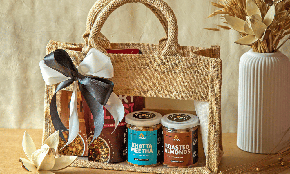 This thoughtfully curated jute bag, filled with healthy snacks, dry fruits, and sweet treats, is perfect for holiday gifting. Elegantly packaged in recyclable jute bad, it’s an ideal choice for both corporate and personal celebrations.