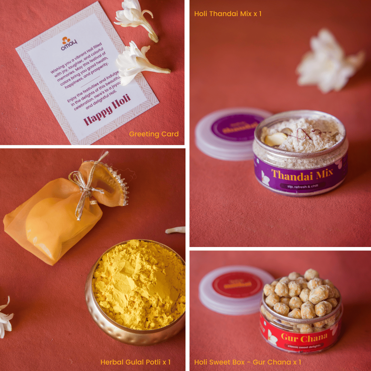 Thoughtfully curated for a vibrant and flavorful experience, Our gift boxes include herbal Gulaal, A refreshing Thandai mix - blend of saffron, cardamom, and all natural ingredients. Along with special holi treat - Gur Chana, adding the perfect touch of sweetness to complete the celebrations.
