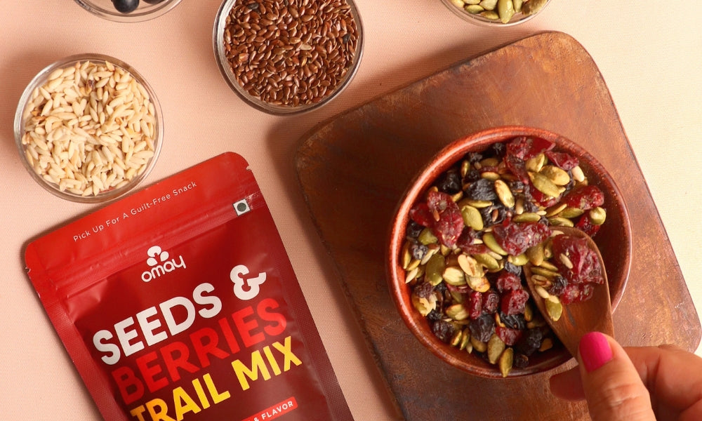 HEALTHY TRAIL MIX: What is it that you get when cranberries, black currant & raisins decide to be friends with flax, muskmelon, and pumpkin seeds? A berry-berry enjoyable experience!