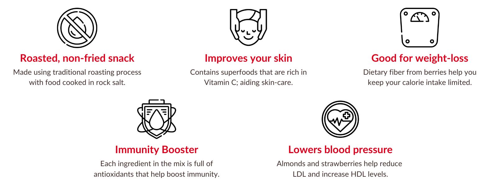 All seeds & nuts in our Berries Mix are roasted in salt; made super crunchy and flavorful. Mixed with naturally dried berries, raisins and currant to give you a power-packed Trail Mix, this snack is full of nutrition, energy, taste and delicious. Crunchy naturally-sweetened snack to binge on anytime, anywhere guilt-free: add to your morning cereals or satiate your midnight cravings, or simply enjoy during a busy work day. 100% roasted, non-fried snack.