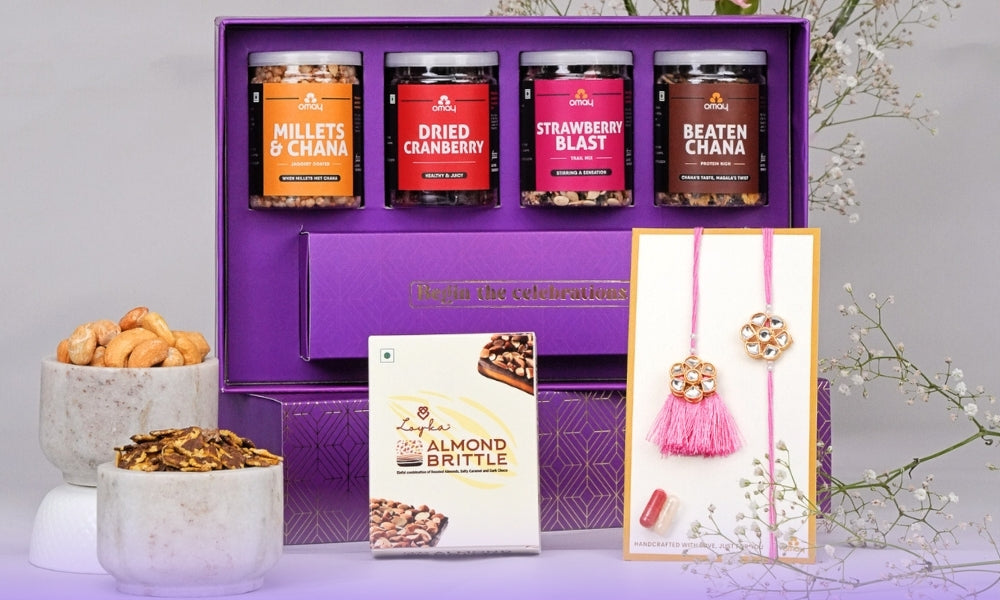 This gift box is filled with delicious healthy snacks, dry fruits, chocolate brittles, handcrafted Rakhi kits, and more. Surprise your Bhai-Bhabhi with this thoughtful gift, perfect for celebrating the bond of love and protection, making your festive moments extra special.