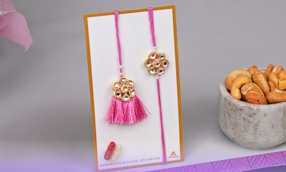 Make your Rakhi celebrations extra special with our exclusive handcrafted Rakhi and roli-chawal set for Bhai-Bhabhi, providing everything you need to celebrate the occassion with your sibling!