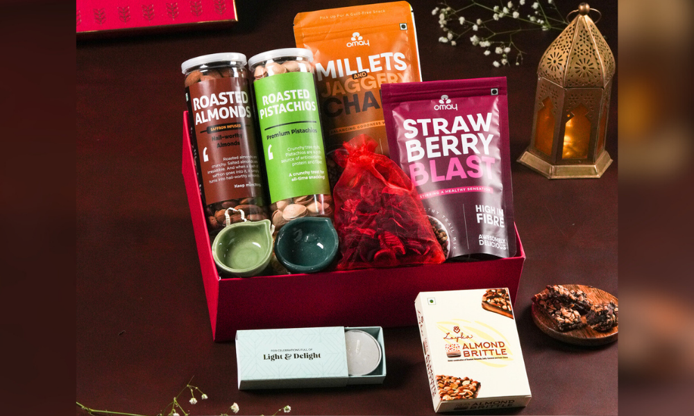 This Omay Foods Diwali Gift Box is filled with delicious healthy snacks, dry fruits, chocolates , handcrafted Diwali essentials, and more making it an ideal choice for both corporate and personal gifting, adding extra joy to the festival of lights.