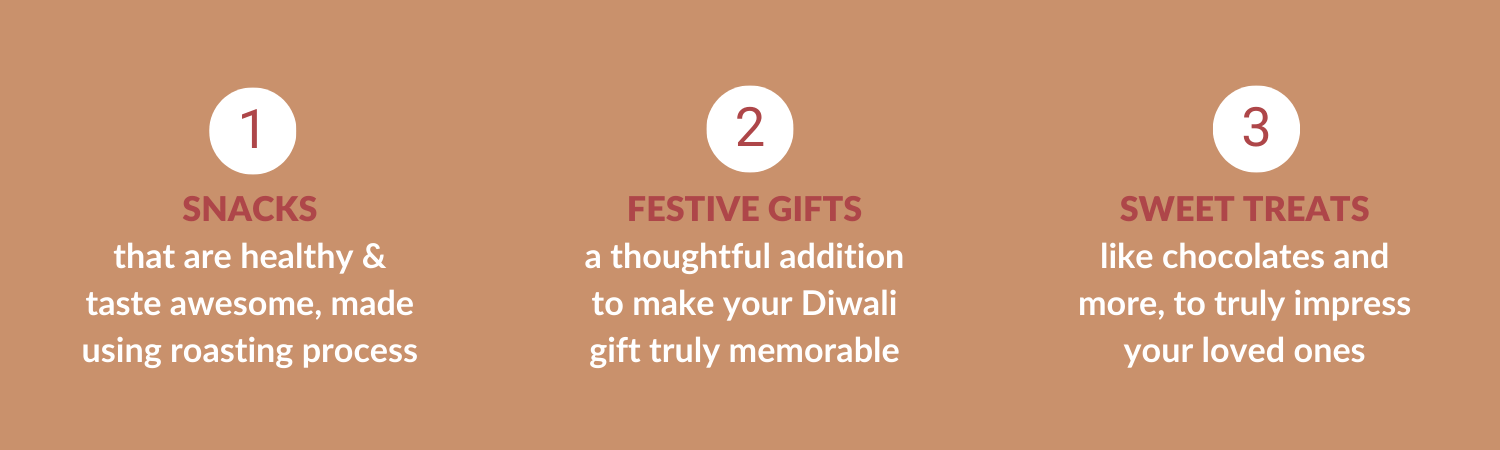 : Berries Mix, 80g, Spiced Almonds, 80g, Navratan Mix, 55g, Millets & Chana, 30g, Saunf Sprinkles x 2, Chocolate Almond Brittle x 1, Ceramic Diya with Wax Candle x 1 and Diwali Greeting Card in a premium Gold-foiled Gift Box packing