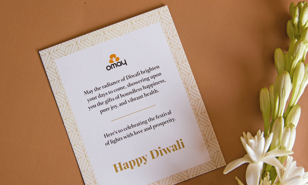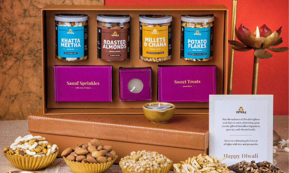 • This Diwali, celebrate the festival of lights with a gift that’s nourishing, thoughtful, and full of festive charm. Curated with care and packed in a premium gold-foiled gift box, this hamper includes Omay Foods’ healthy roasted snacks, dry fruits, Saunf Sprinkles, & Chocolate Almond Brittle — perfectly complemented by a Ceramic Diya with Wax Candle, and a warm Diwali Greeting Card. A beautiful blend of health and indulgence, this box is ideal for showing appreciation to your team, delighting clients, or surprising loved ones. Gift light, warmth, and wellness this Diwali — with Omay Foods.