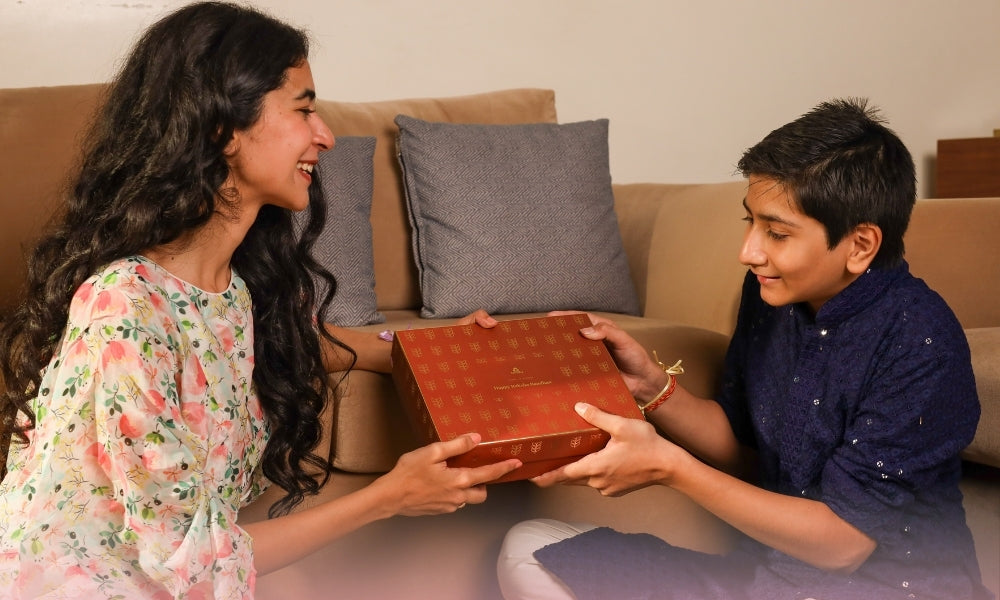 This gift box includes a custom-made Rakhi greeting card, adding a heartfelt touch that ensures your sibling feels cherished and loved during this Raksha Bandhan celebration.
