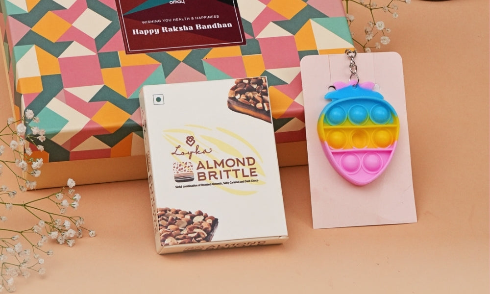Indulge in the sweetness of Raksha Bandhan with delightful chocolate almond brittle. Paired by a charming Poppit Keychain, these treats add an extra dash of joy to your celebrations.