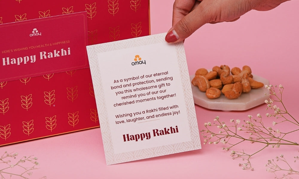 This gift box includes a custom-made Rakhi greeting card, adding a heartfelt touch that ensures your sibling feels cherished and loved during this Raksha Bandhan celebration.