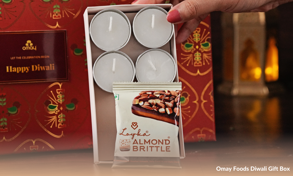 • Delight your teams, clients, friends, and family this festive season with Omay Foods' Mixed Delights Diwali Gift Box. This carefully curated Diwali gift box features a premium assortment of roasted, non-fried snacks, including saffron-infused Roasted Almonds and Cashews, Millets & Jaggery-coated Chana, and chocolate almond brittle. Along with these, you'll find a set of T-Light Candles and a Diwali Greeting Card, all elegantly packaged in a gold-foiled gift box. Perfect for both corporate Diwali hampers and personal gifting, this hamper captures the essence of Diwali by blending tradition with thoughtful selections of festive essentials.