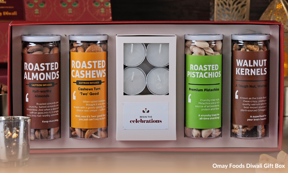 Hamper offers all-in-one Diwali festivities for you to gift your loved ones. Diyas to lighten, Almond Brittols as sweets, and roasted snacks.