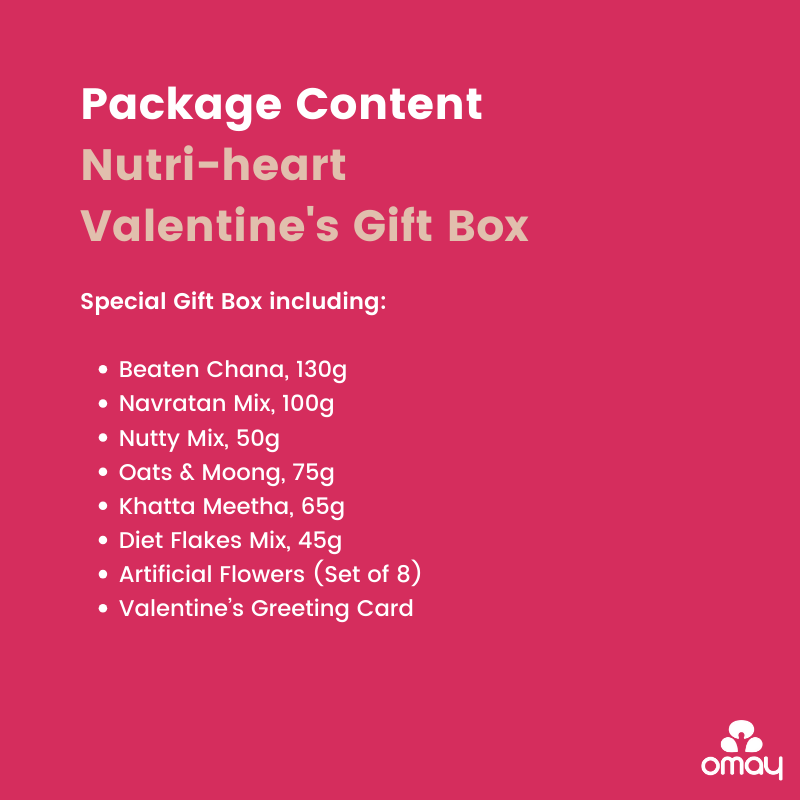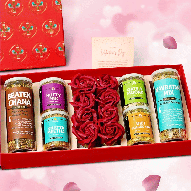 • This Omay Foods Valentine’s Day Gift Box is a thoughtfully curated hamper featuring roasted snacks, dry fruits, premium chocolates, love-themed gift items, and more. A perfect blend of delicious treats and thoughtful touches, it’s designed to make your Valentine’s Day truly special. Whether for your girlfriend, boyfriend, wife, or husband, this gift box is sure to delight and show just how much they mean to you.
