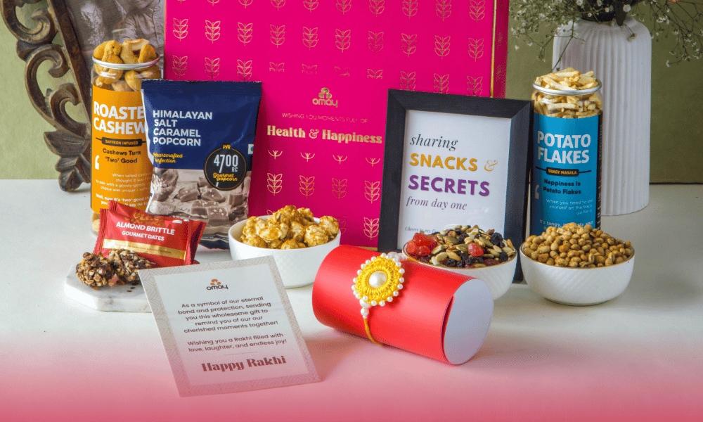 Packed with loads of delicious healthy snacks, dry-fruits, sweet delights, handcrafted Rakhi kits and more, this Rakhi Gift is the perfect treats for your sibling, this Raksha Bandhan.