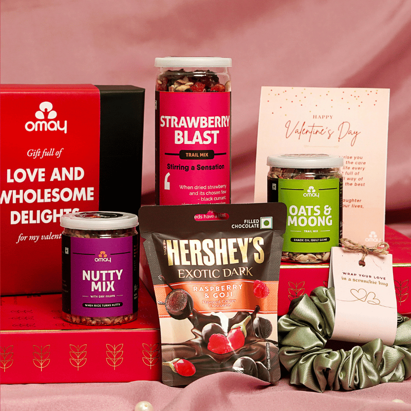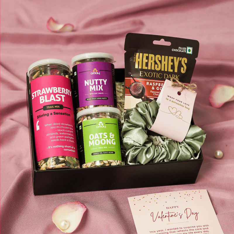 Packed with wholesome snacks, premium satin scrunchies, and chocolates – the ideal gift for the women who matter most in your life - whether it's your mom, wife, girlfriend, or a dear friend or colleague! Elevate any occasion with Omay Foods