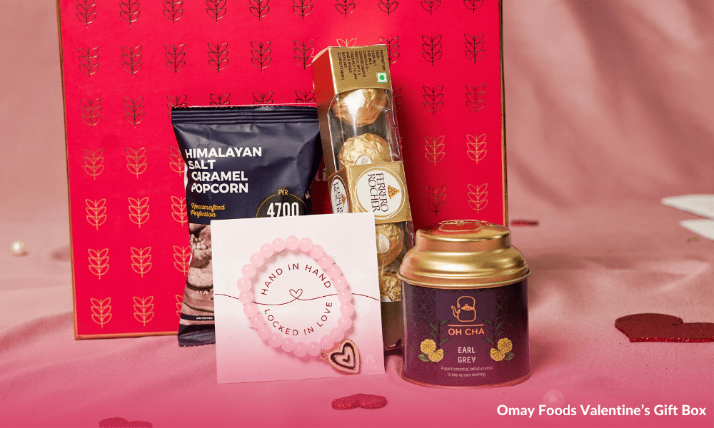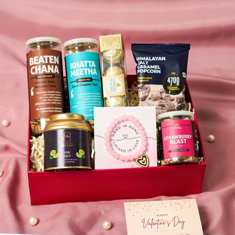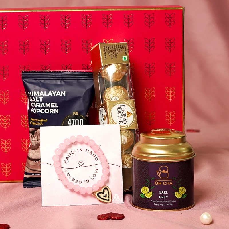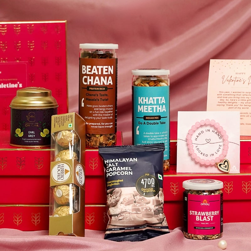 Get ready to snuggle up and savor the goodness in this box, featuring gourmet popcorns, Ferrero Rocher chocolates, and comforting herbal teas - a sweet treat for a cozy Valentine's indulgence for your partner.