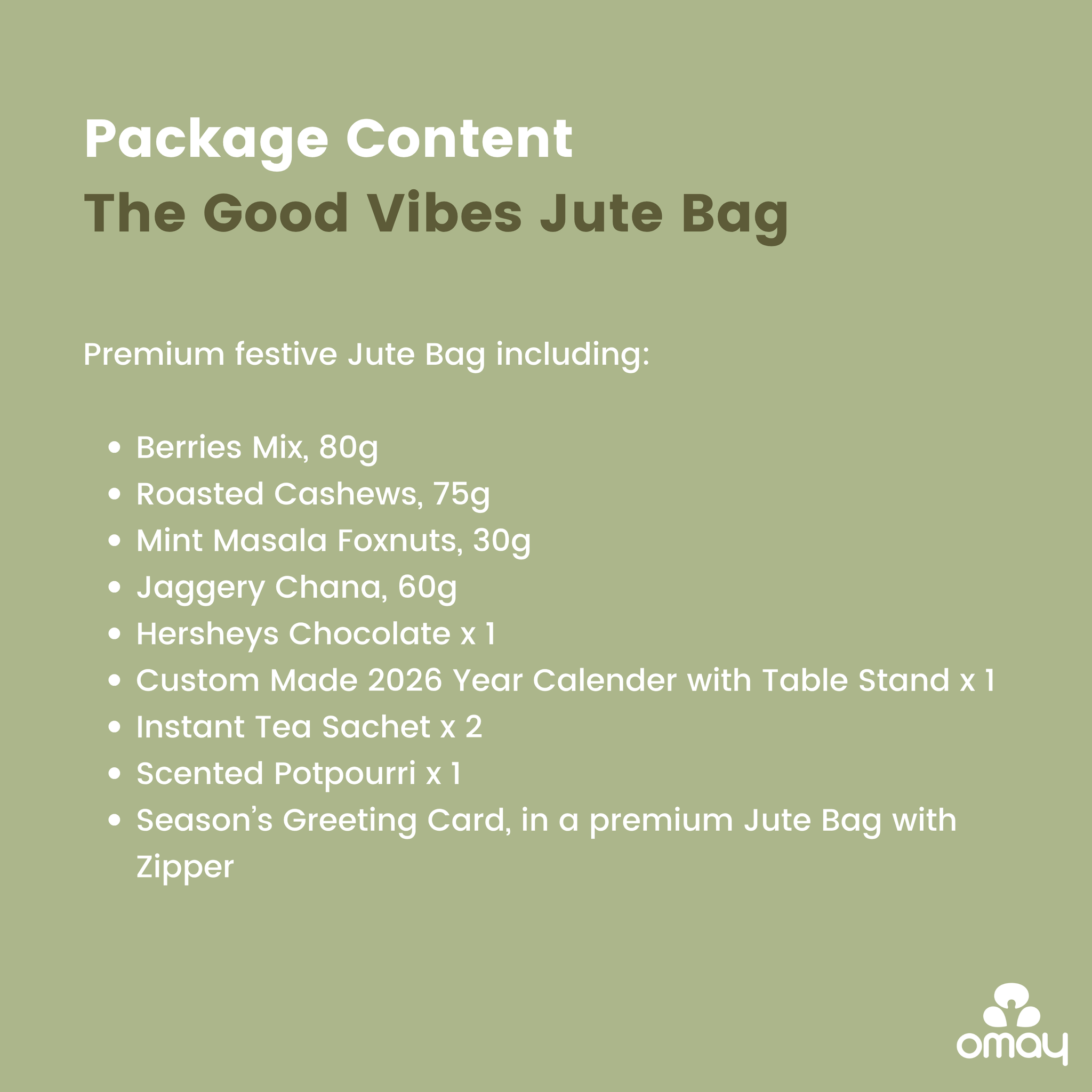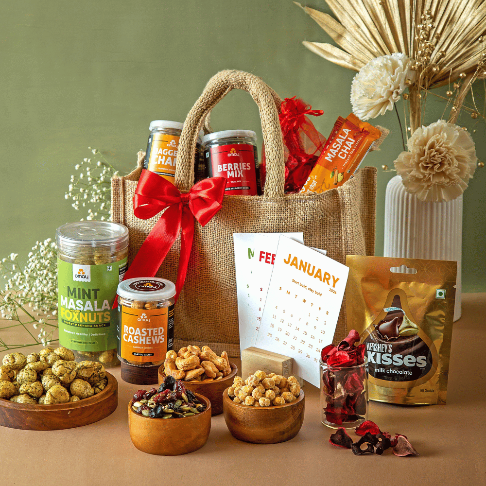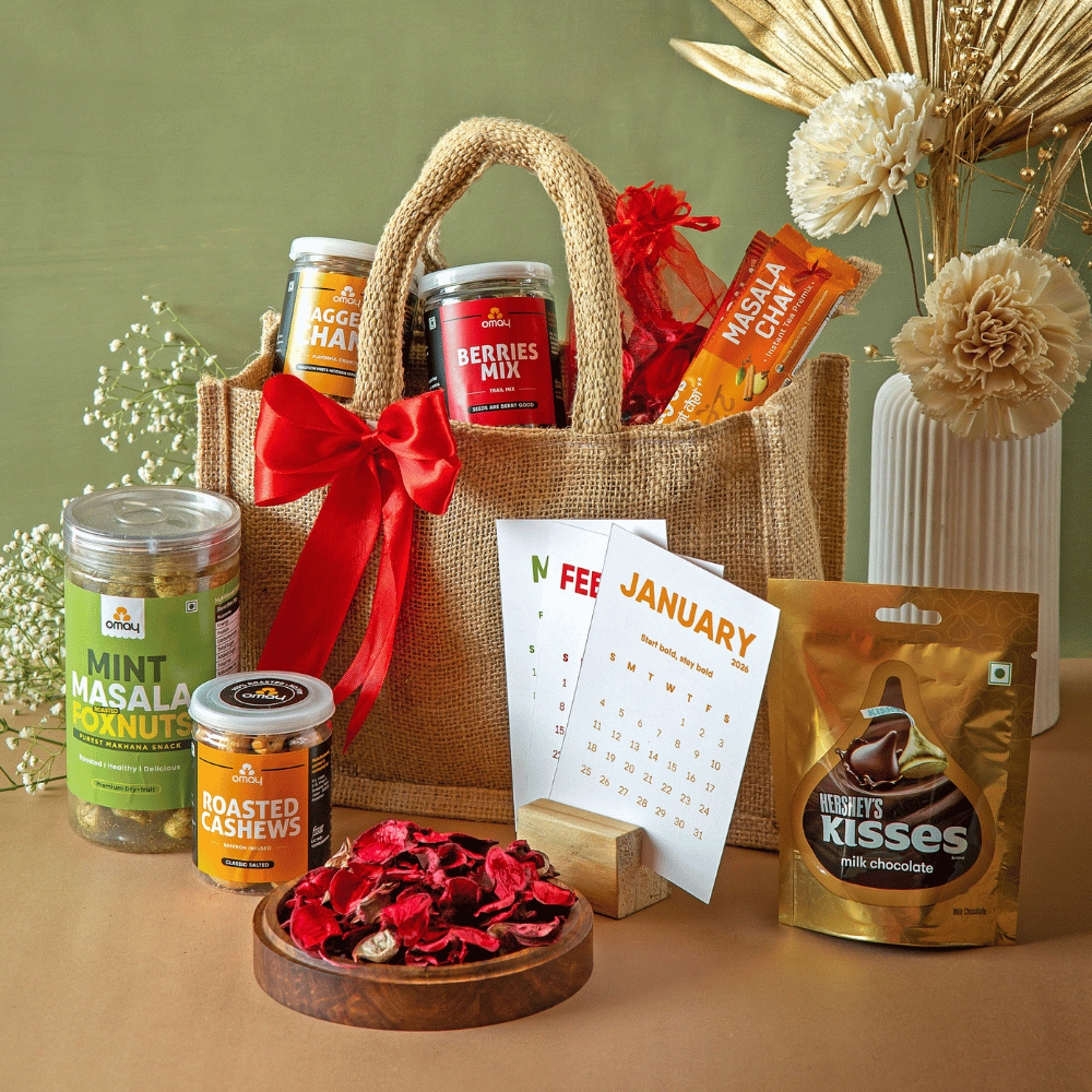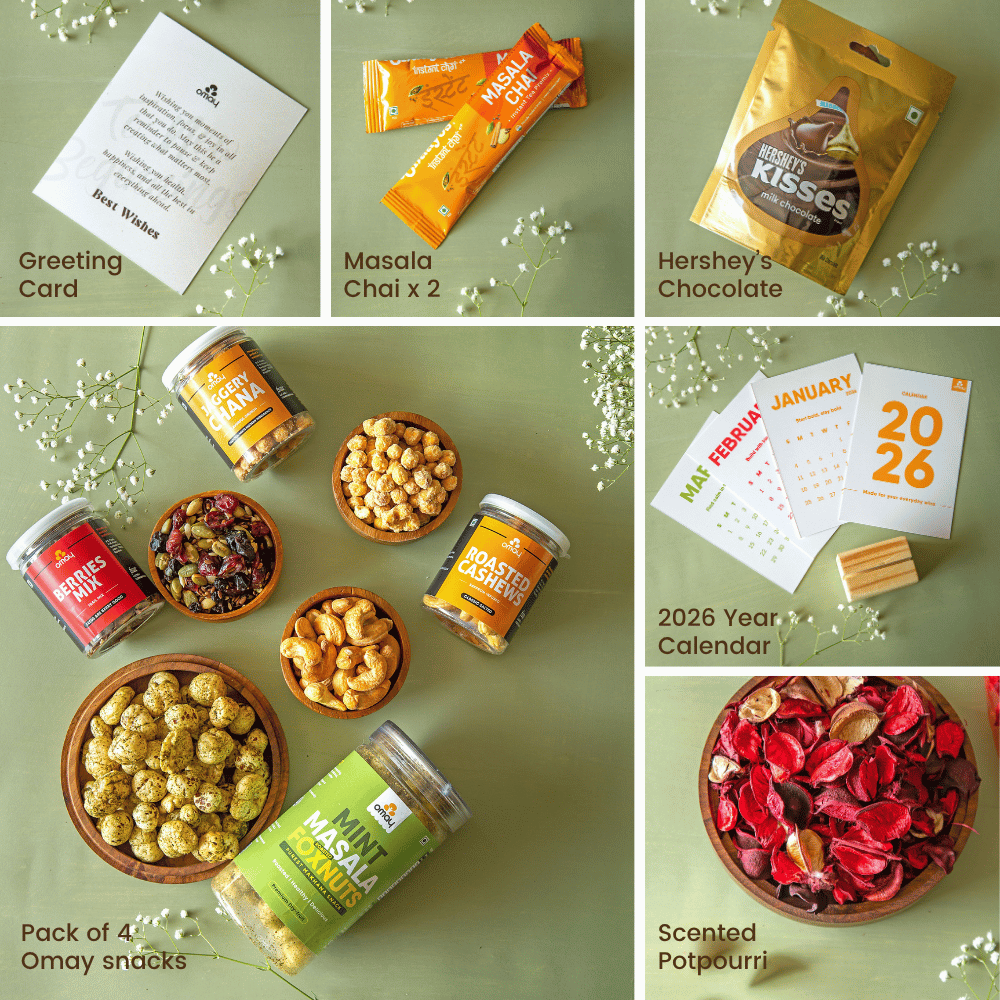 Package Content: Berries Mix, 80g, Roasted Cashews, 75g, Mint Masala Foxnuts, 30g, Jaggery Chana, 60g, Hershey's Chocolate x 1, Custom Made 2026 Year Calendar with Table Stand x 1, Instant Tea Sachet x 2, Scented Potpourri x 1, Season's Greeting Card in a premium Jute Bag with Zipper
